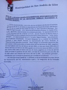 El acta ( foto ) firmada hoy, estipulaba lo que hoy a la mañana informamos, 10% acumulativo sobre el salario a cobrar a fin de febrero, 5 % sobre el salario de marzo y un 5 % sobre el salario de Abril. Deesta manera el ejecutivo afirma que lo auentado sobre durante el periodo 2025 seria 0,69% mas alto que la inflacion acumulada en el año finalizado en diciembre. De todas maneras el ejecutivo hara el ajuste salarial unilateralmente.