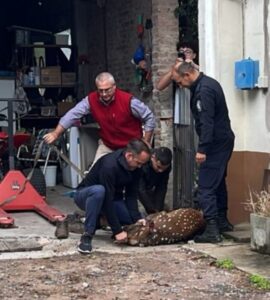 Ya es moneda corriente el avistamiento de fauna silvestre en las calles de San Andrés de Giles. A los registros de pumas, carpinchos y gatos monteses, hoy se sumó un ciervo que sorprendió a los transeúntes. El animal fue visto esta mañana corriendo por la calle Belgrano y, en su desorientación, terminó ingresando en un comercio de la zona rompiendo un vidrio y terminando herido. La policia fue advertida y la direccion de bromatologia logro reducirlo..